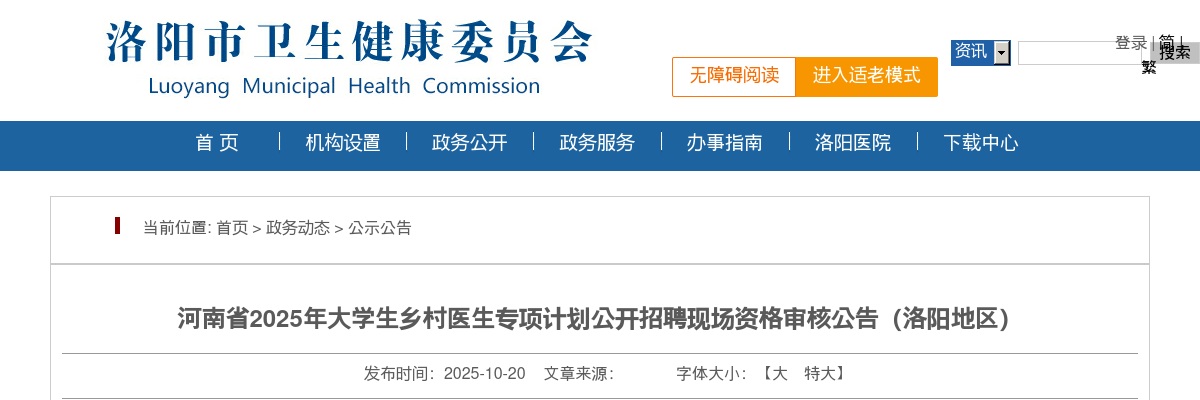 原标题:河南省2025年大学生乡村医生专项计划公开招聘现场资格审核公告(洛阳地区)